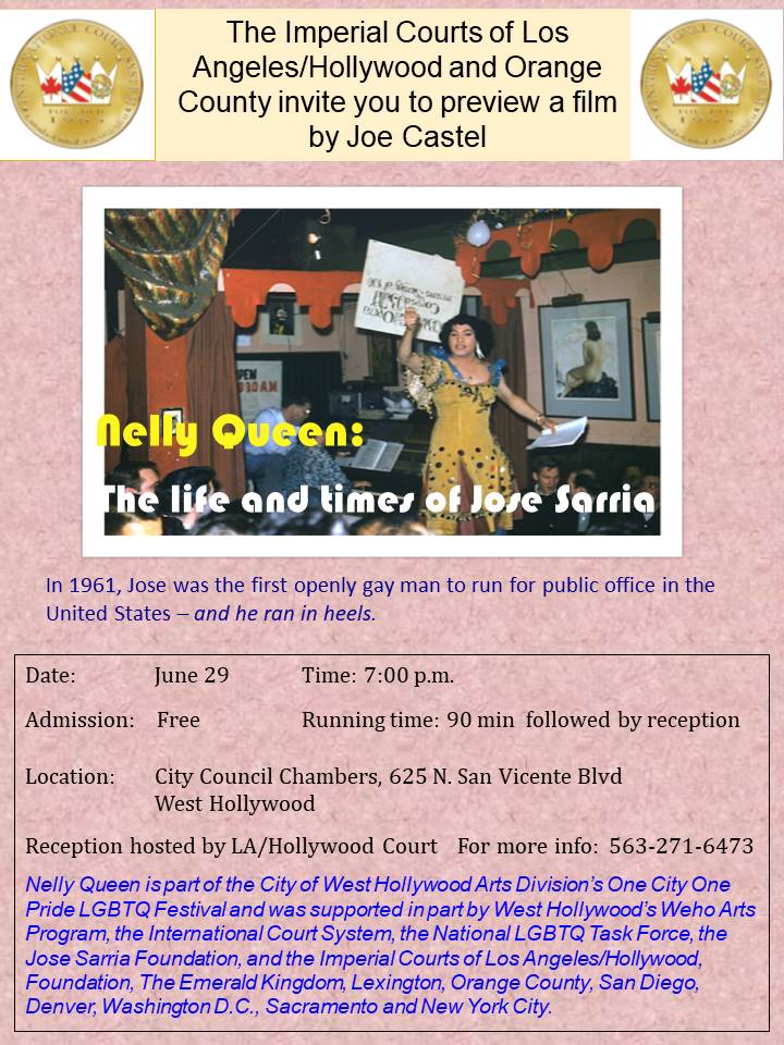 The Imperial Courts of Los Angeles/Hollywood and Orange County invite you to a screening of Nelly Queen: The Life & Time of Jose Sarria on June 29th at 7pm in the West Hollywood City Council Chambers, located at 625 N Vincente Blvd, West Hollywood, CA.